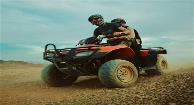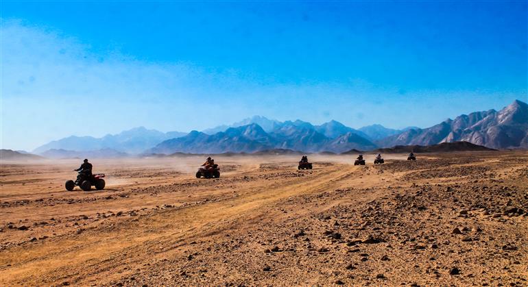Following a pick-up from your hotel in Hurghada, Makadi Bay or Sahl Hashish, transfer to the quad bike test station, where you will meet your guides and get a short, 10-minute test drive on your bike. Then, drive for about 12 miles (20 kilometers) into the dramatic desert landscape.
