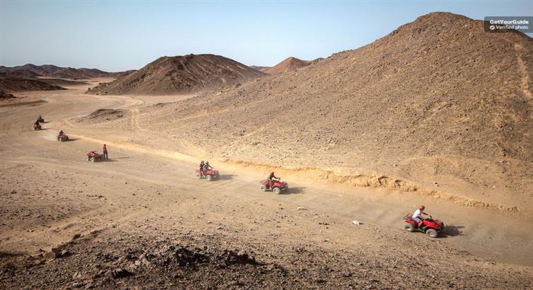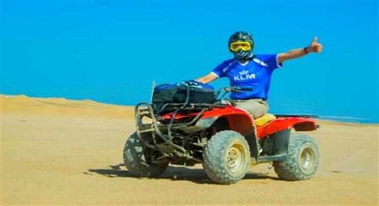 You will be picked up in a jeep from your hotel. Accompanied by your guide, you will be taken to the quad parking place in Badawia. After a brief session on how to operate the bike that will make sure that you can master your quad bike, we will drive about 45 minutes through the rough and impressive desert landscape.